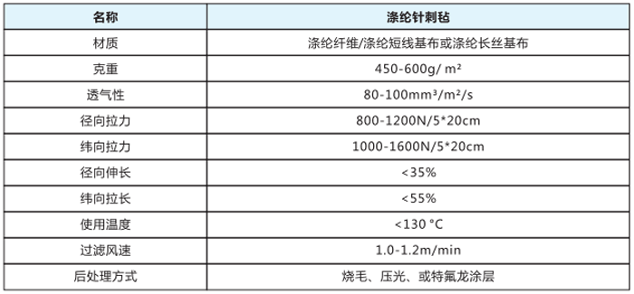 滌綸針刺氈是采用非織造工藝利用纖維交錯排列,空隙分布均勻的細纖維布,以滌綸短纖維與滌綸有捻紗所生產(chǎn)的針刺氈,表面經(jīng)熱軋、燒毛或涂層等后處理,使其表面平整光滑,不易被粉塵所堵塞,此濾料空隙率大,透氣性能較好,用途極為廣泛,抗化學(xué)穩(wěn)定性強,不僅可以過濾常溫氣體,而且可過濾含有酸堿的腐蝕性氣體,并可濾水、濾油,是常溫工況。液固分離等領(lǐng)域理想的過濾材料。