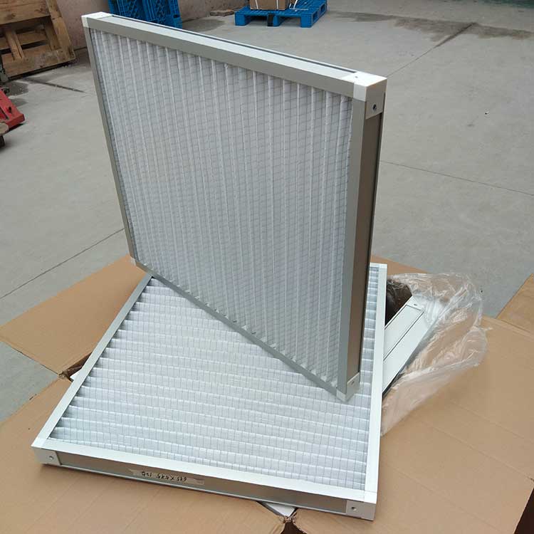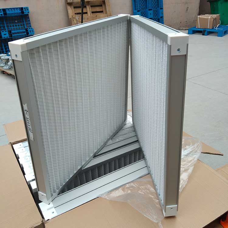 過濾材料是以折疊形式裝入高強度模切硬紙板內(nèi),迎風面積增大。流入的空氣中的塵埃粒子被過濾材料有效阻擋在褶與褶之間。潔凈空氣從另一面均勻流出,因此氣流通過過濾器是平緩和均勻的。視過濾材料不同,它所阻擋的粒徑從0.5μm到5μm而不同,過濾效率也不同 。