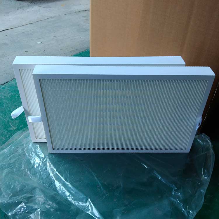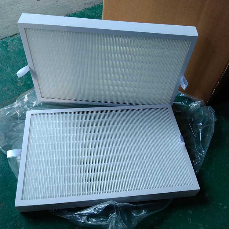 過濾材料是以折疊形式裝入高強度模切硬紙板內(nèi),迎風面積增大。流入的空氣中的塵埃粒子被過濾材料有效阻擋在褶與褶之間。潔凈空氣從另一面均勻流出,因此氣流通過過濾器是平緩和均勻的。視過濾材料不同,它所阻擋的粒徑從0.5μm到5μm而不同,過濾效率也不同 。