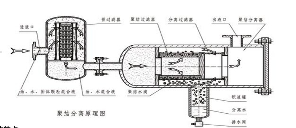 聚結(jié)系統(tǒng)由一組聚結(jié)濾芯組成,聚結(jié)濾芯采用了獨特的極性分子結(jié)構(gòu),油液中的游離水及乳化水在通過濾芯后,被聚結(jié)成較大的水滴,再依靠重力的作用下沉降至儲水罐內(nèi)。